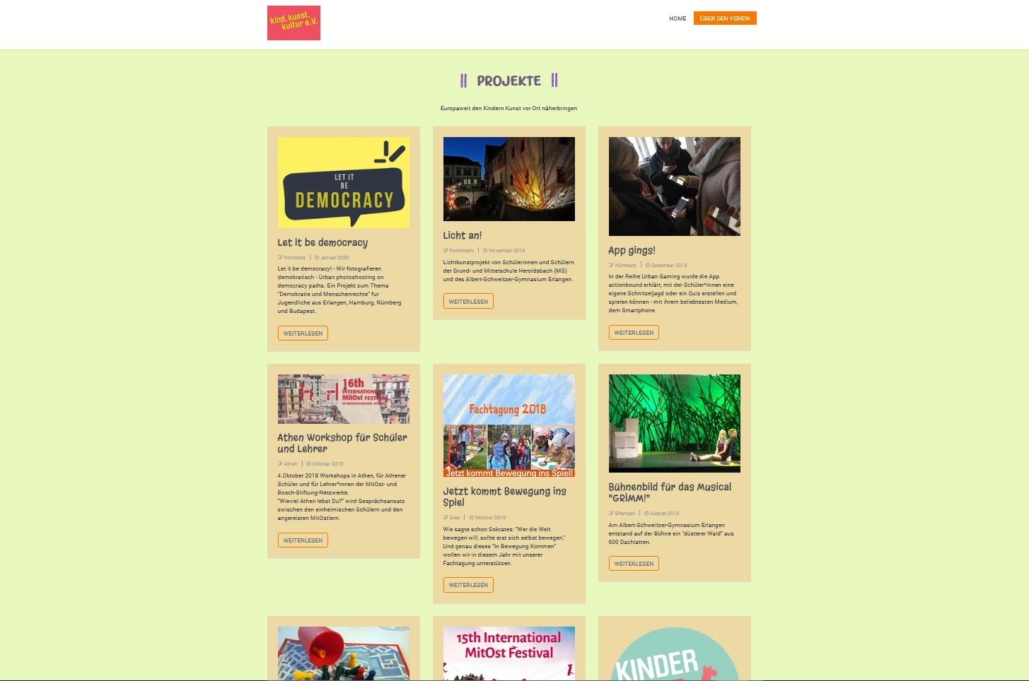 Vereinswebseite mit Projektaufzählung.